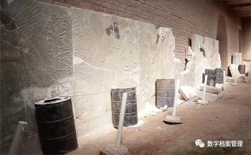 尼姆鲁德西北宫殿的浮雕墙前摆放的油桶炸弹(宫殿的浮雕墙属于珍贵的石刻档案) 放眼国际,在社会文明高度发达的当代,这样的灾难却还在上演。2001年3月阿富汗塔利班悍然炸毁巴米扬大佛;2012年始,极端组织ISIS相继在马里廷巴克图古城,伊拉克尼尼微省摩苏尔、尼姆鲁德和豪尔萨巴德大肆毁坏珍贵的亚述文化遗址、遗迹,其中不乏珍贵的古代手卷。 我国的战时国家档案的管理