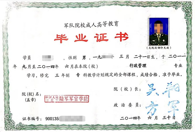 以上五种毕业证都是国民教育的毕业证,而在部队院校的军自考、军队成人教育等毕业证抬头,虽然略有不同,但依旧是这五种形式。