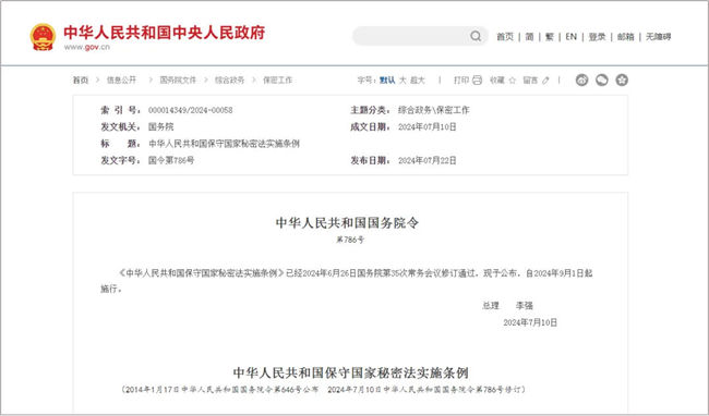 《中华人民共和国保守国家秘密法实施条例》已经2024年6月26日国务院第35次常务会议修订通过,现予公布,自2024年9月1日起施行。