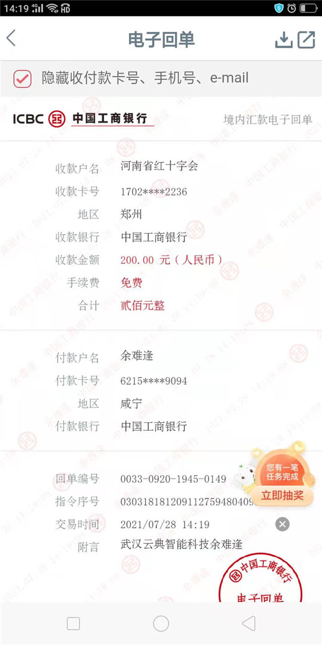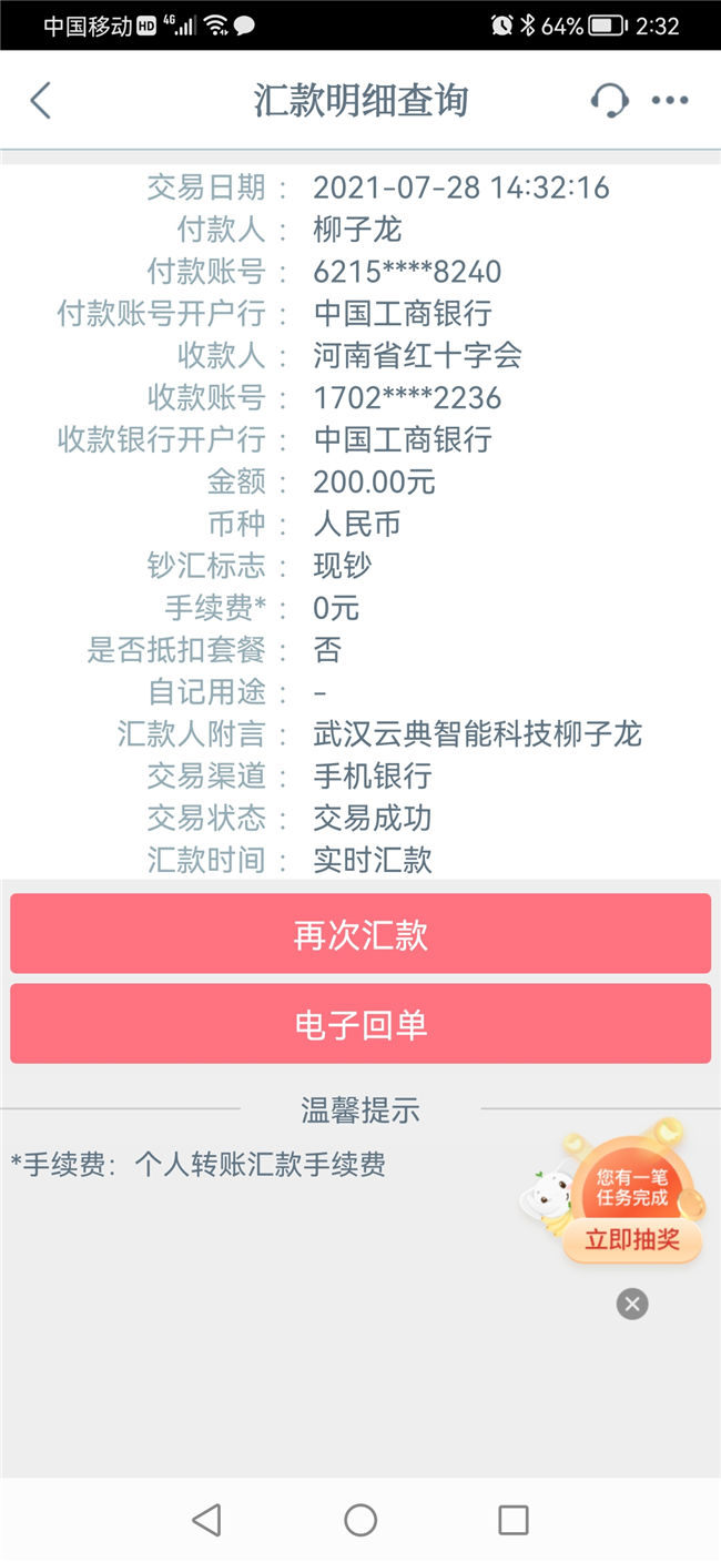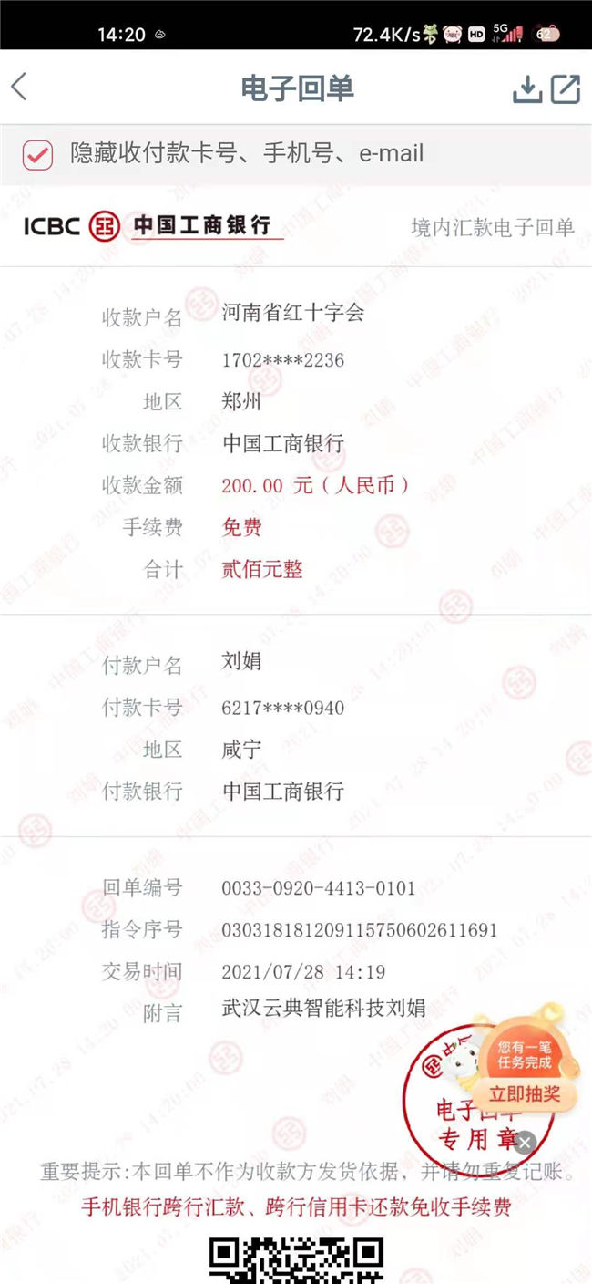 — 武汉云典智能科技有限公司员工积极为河南灾区捐款