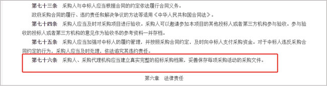 《政府采购货物和服务招标投标管理办法》第七十六条要求,采购人、采购代理机构应当建立真实完整的招标采购档案,妥善保存每项采购活动的采购文件。