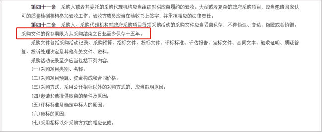 《中华人民共和国政府采购法(2014年修订)》第四十二条 采购人、采购代理机构对政府采购项目每项采购活动的采购文件应当妥善保存,不得伪造、变造、隐匿或者销毁。采购文件的保存期限为从采购结束之日起至少保存十五年。