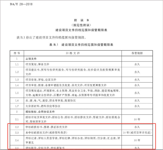 DA/T 28-2018《建设项目档案管理规范》附录表B.1 建设项目文件归档范围和保管期限表中指出:中标的投标书、澄清、修正补充文件保管期限为永久;未中标文件(或作资料保存)保管期限10年。