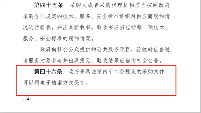 《中华人民共和国政府采购法实施条例》(中华人民共和国国务院令第658号)第四十六条 政府采购法第四十二条规定的采购文件,可以用电子档案方式保存。