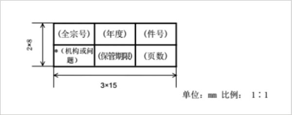 《归档文件整理规则》规定,归档文件应在首页上端的空白位置加盖归档章并填写相关内容。归档章应将档号的组成部分,即全宗号、年度、保管期限、件号,以及页数作为必备项,机构(问题)可以作为选择项。在样式上,《规则》维持六格章样式不变,规格为长45mm,宽16mm,分为均匀的6格,如图所示。